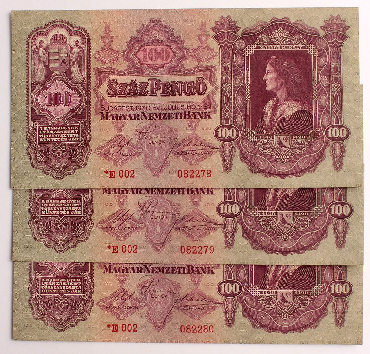 100 pengő 1930 csillagos 3db. sorszámkövető