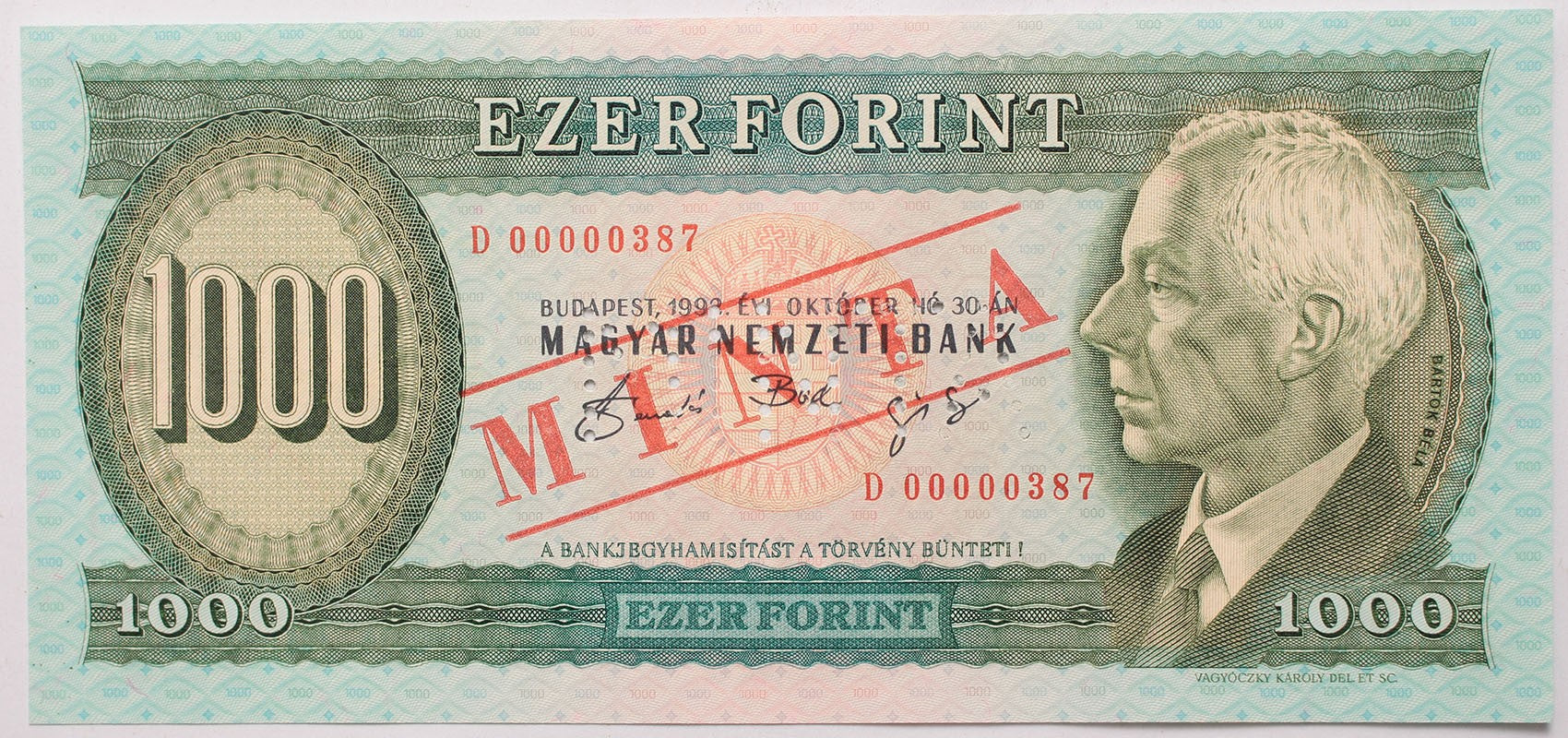 1000 forint 1993 D minta lyukasztás és felülnyomás