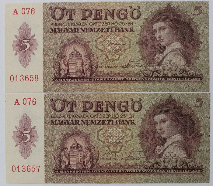 5 Pengő 1939 sorszámkövető 2 db.
